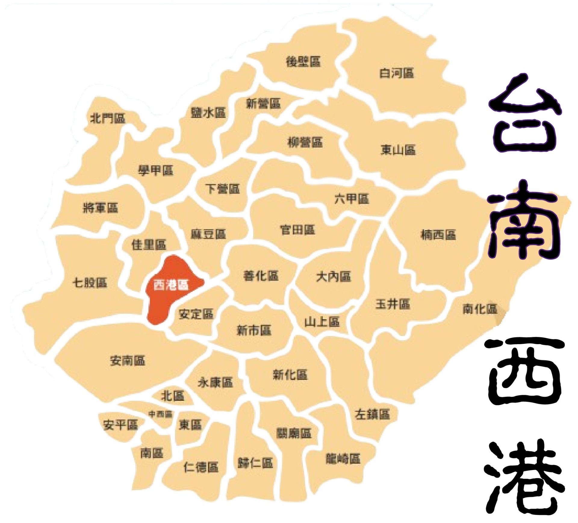二次大戰後,民國卅十五年(1946年)將西港庄改為西港鄉,隸屬臺南縣北門區。「縣轄區」裁撤後,直屬於縣。2010年12月25日因行政區劃改制,改為西港區。